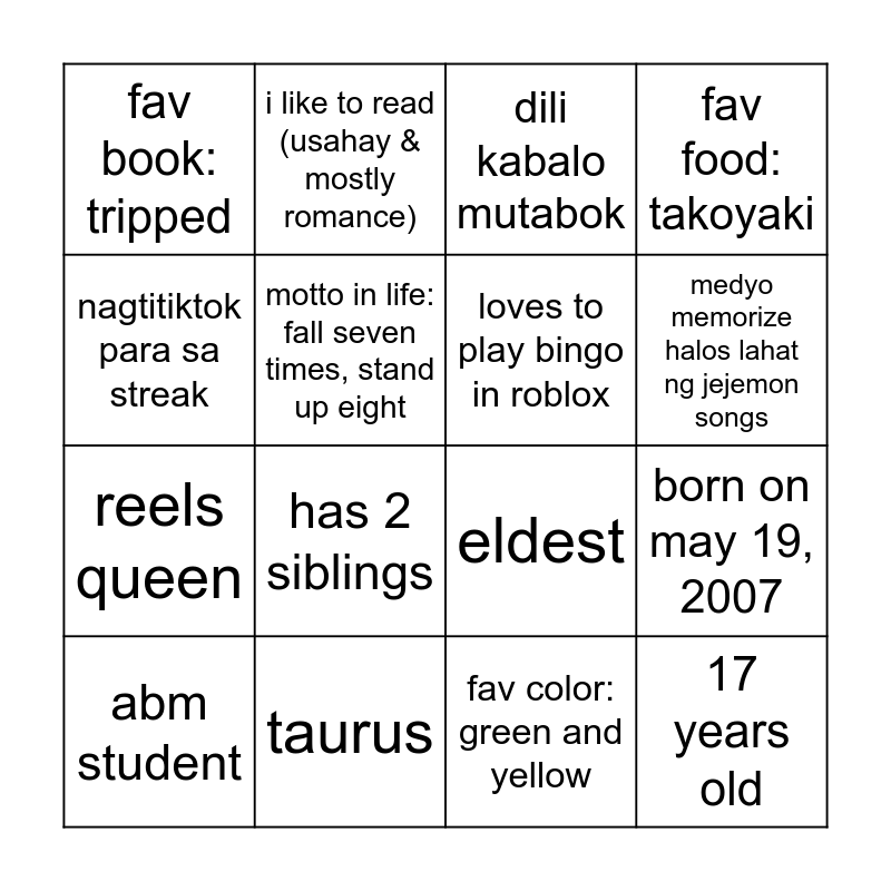This bingo card has 16 words: taurus, born on may 19, 2007, dili kabalo mutabok, fav book: tripped, reels queen, i like to read (usahay & mostly romance), eldest, fav color: green and yellow, nagtitiktok para sa streak, motto in life: fall seven times, stand up eight, abm student, fav food: takoyaki, has 2 siblings, medyo memorize halos lahat ng jejemon songs, loves to play bingo in roblox and 17 years old.