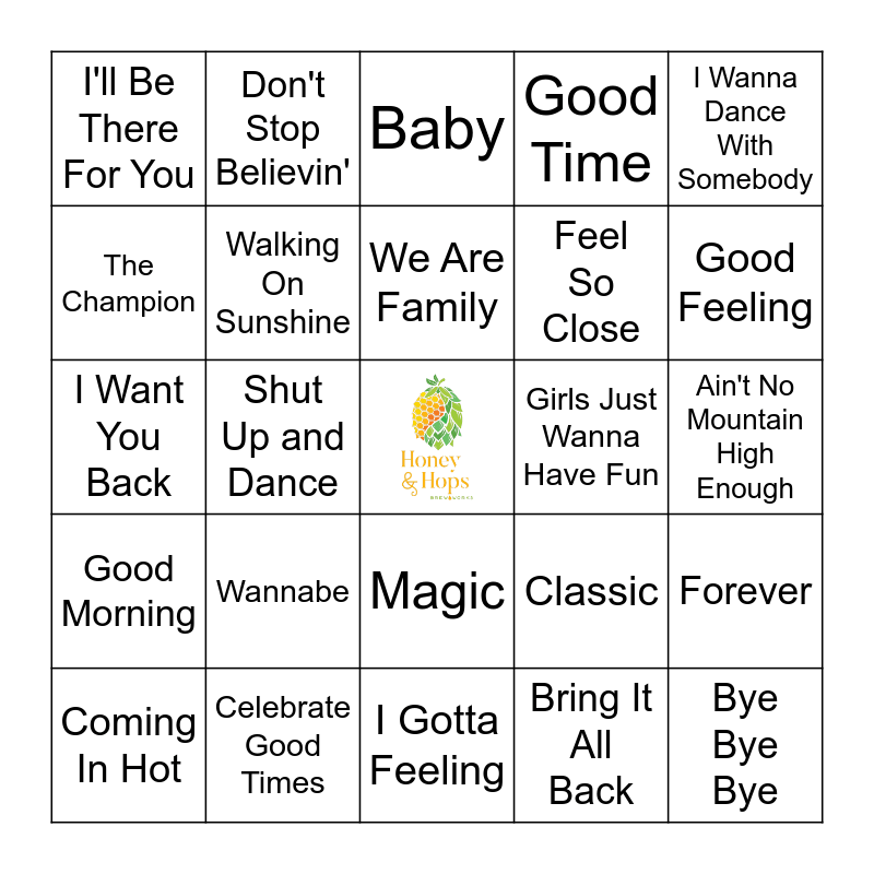 This bingo card has a free space and 40 words: ABC, I Want You Back, Signed, Sealed, Delivered (I'm Yours), Walking On Sunshine, Celebrate Good Times, Magic, We Are Family, Can't Stop This Feeling!, I Wanna Dance With Somebody, Good Morning, Shut Up and Dance, Good Time, Bye Bye Bye, Ain't No Mountain High Enough, Girls Just Wanna Have Fun, Wannabe, What Makes You Beautiful, I'll Be There For You, Best Song Ever, Baby, Forever, Bring It All Back, Feel So Close, The Champion, The Middle, High Hopes, No Scrubs, Stronger (What Doesn't Kill You), Year 3000, You Can't Stop Me, Church Clap, Coming In Hot, Better When I'm Dancin', Classic, Good Feeling, I Gotta Feeling, Shake It Off, We're All In This Together, Don't Stop Believin' and Don't Stop.