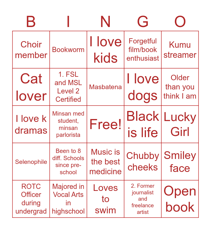 This bingo card has a free space and 24 words: Been to 8 diff. Schools since pre-school, Majored in Vocal Arts in highschool, Masbatena, ROTC Officer during undergrad, Kumu streamer, Choir member, Cat lover, Bookworm, Black is life, Music is the best medicine, I love dogs, I love k dramas, Chubby cheeks, Smiley face, 1. FSL and MSL Level 2 Certified, 2. Former journalist and freelance artist, Lucky Girl, I love kids, Older than you think I am, Minsan med student, minsan parlorista, Open book, Selenophile, Forgetful film/book enthusiast and Loves to swim.