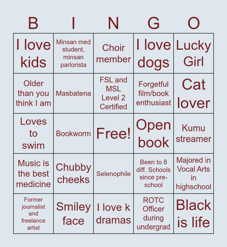 This bingo card has a free space and 24 words: Chubby cheeks, Smiley face, FSL and MSL Level 2 Certified, Former journalist and freelance artist, Lucky Girl, I love kids, Older than you think I am, Minsan med student, minsan parlorista, Open book, Selenophile, Forgetful film/book enthusiast, Loves to swim, Been to 8 diff. Schools since pre-school, Majored in Vocal Arts in highschool, Masbatena, ROTC Officer during undergrad, Kumu streamer, Choir member, Cat lover, Bookworm, Black is life, Music is the best medicine, I love dogs and I love k dramas.