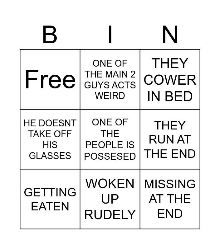 This bingo card has a free space and 11 words: AT NIGHT, WOKEN UP RUDELY, MISSING AT THE END, GETTING EATEN, ONE OF THE MAIN 2 GUYS ACTS WEIRD, THEY COWER IN BED, THEY RUN AT THE END, THEY PICK UP THE CAMERAS BEFORE HELPING, HE DOESNT TAKE OFF HIS GLASSES, Free and They don’t defeat the monster.