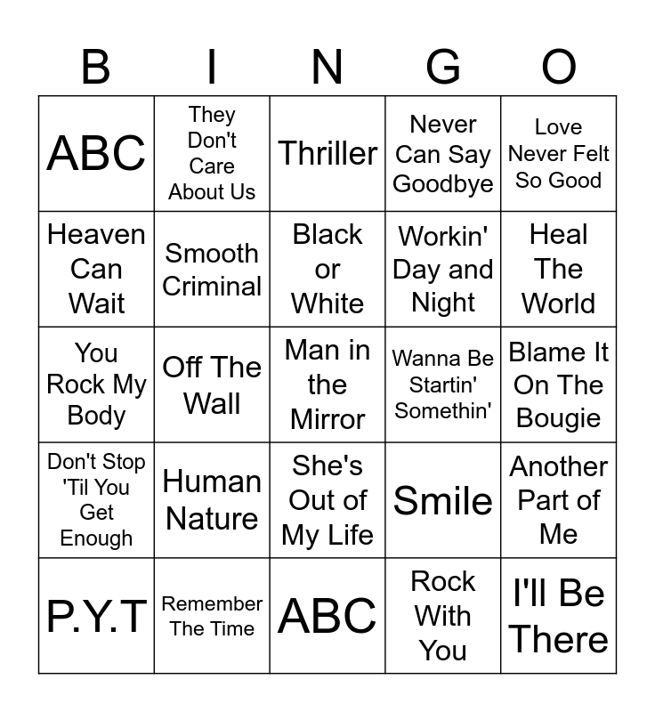 This bingo card has a free space and 34 words: Billie Jean, Rock With You, Chicago, Beat It, Don't Stop 'Til You Get Enough, Smooth Criminal, Love Never Felt So Good, P.Y.T, They Don't Care About Us, The Way You Make Me Feel, Black or White, Thriller, The Girl Is Mine, Bad, Wanna Be Startin' Somethin', Heal The World, Remember The Time, You Rock My Body, Human Nature, Smile, She's Out of My Life, I Want You Back, ABC, Blame It On The Bougie, ABC, I'll Be There, Never Can Say Goodbye, Dangerous, Workin' Day and Night, Heaven Can Wait, You Are Not Alone, Off The Wall, Another Part of Me and Leave Me Alone.