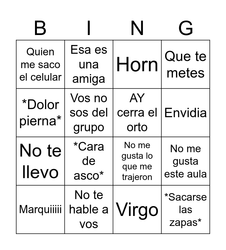 This bingo card has 16 words: No te hable a vos, No me gusta este aula, Horn, Quien me saco el celular, No te llevo, Esa es una amiga, No me gusta lo que me trajeron, Virgo, *Dolor pierna*, Vos no sos del grupo, Marquiiiii, Que te metes, *Cara de asco*, Envidia, AY cerra el orto and *Sacarse las zapas*.