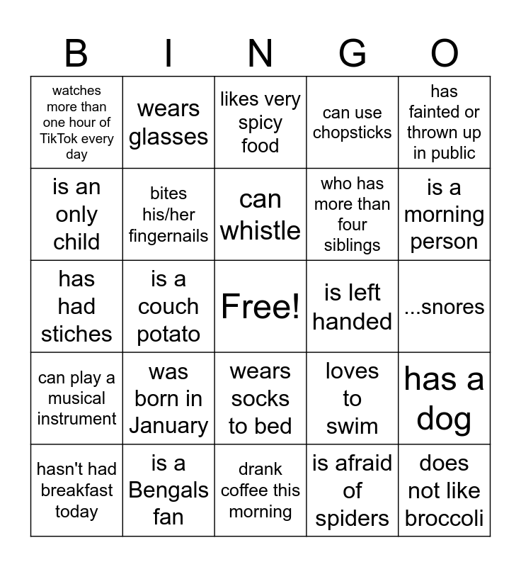 This bingo card has a free space and 29 words: hasn't had breakfast today, enjoys math, is a couch potato, plays a school sport, watches more than one hour of TikTok every day, likes very spicy food, bites his/her fingernails, was born in January, is left handed, is a Bengals fan, ...snores, does not like broccoli, drank coffee this morning, is afraid of spiders, is a morning person, doesn't have a middle name, wears socks to bed, can play a musical instrument, has fainted or thrown up in public, has had stiches, loves to swim, has a cat, who has more than four siblings, is an only child, can use chopsticks, wears glasses, has a dog, can whistle and favorite music is rap.