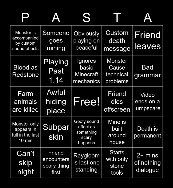This bingo card has a free space and 44 words: Abrupt ambiance change, 2+ mins of nothing dialogue, Weirdly written dialogue, Can’t skip night, Raygloom dies to monster, Starts with only stone tools, Obviously playing on peaceful, Monster disappears into thin air, Friend leaves, Friend encounters scary thing first, Custom death message, Friend dies offscreen, Goofy sound effect as something scary happens, Subpar skin, Noise ruins decent scare, Raygloom is last one standing, Ugly base, Farm animals are killed, Crazy thing is done off camera, Bad grammar, Someone goes mining, Goofy monster design, Person sneaks around for no reason, Monster is accompanied by custom sound effects, Video is over 20 minutes long, Video ends on a jumpscare, Only II players, ~5 min gap between scares, Mine is built around house, Monster only appears in full in the last 10 min, Dumb names, Death is permanent, Friends get hostile with each other, Animal that is clearly controlled by a person, Awful hiding place, Someone goes on a tangent, Never mine ores on camera, Dumb decision making, Ignores basic Minecraft mechanics, Blood as Redstone, Monster Cause technical problems, Forced Scare, Playing Past 1.14 and Disappointing Ending.