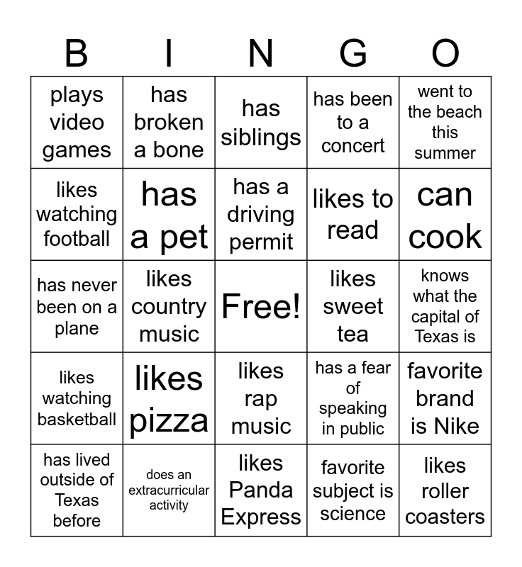 This bingo card has a free space and 24 words: likes pizza, does an extracurricular activity, has a driving permit, has lived outside of Texas before, went to the beach this summer, plays video games, likes watching football, has broken a bone, likes sweet tea, likes rap music, likes to read, has never been on a plane, has a fear of speaking in public, favorite brand is Nike, has a pet, favorite subject is science, knows what the capital of Texas is, has siblings, can cook, likes country music, likes roller coasters, likes watching basketball, has been to a concert and likes Panda Express.