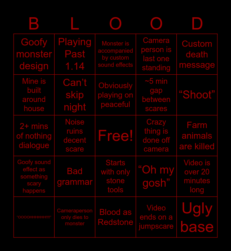 This bingo card has a free space and 40 words: Abrupt ambiance change, 2+ mins of nothing dialogue, Weirdly written dialogue, Can’t skip night, Cameraperson only dies to monster, Starts with only stone tools, Obviously playing on peaceful, Monster disappears into thin air, Custom death message, Goofy sound effect as something scary happens, Noise ruins decent scare, Camera person is last one standing, Ugly base, Farm animals are killed, Crazy thing is done off camera, Bad grammar, Someone goes mining, Goofy monster design, Person sneaks around for no reason, Monster is accompanied by custom sound effects, Video is over 20 minutes long, Video ends on a jumpscare, ~5 min gap between scares, Mine is built around house, Monster only appears in full in the last 10 min, Death is permanent, Animal that is clearly controlled by a person, Awful hiding place, Never mine ores on camera, Dumb decision making, Ignores basic Minecraft mechanics, “OOOOHHHHHH!!!!”, Says the word creepypasta, “Oh my gosh”, “Shoot”, Blood as Redstone, Monster Cause technical problems, Forced Scare, Playing Past 1.14 and Disappointing Ending.