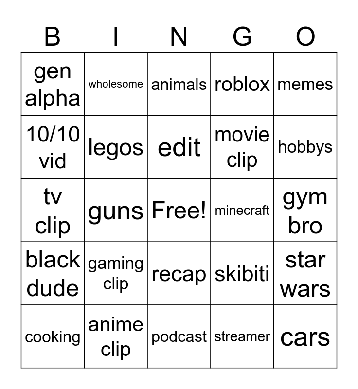 This bingo card has a free space and 24 words: gaming clip, anime clip, edit, cooking, memes, gen alpha, 10/10 vid, wholesome, minecraft, recap, movie clip, tv clip, skibiti, star wars, legos, streamer, gym bro, animals, hobbys, guns, cars, black dude, roblox and podcast.