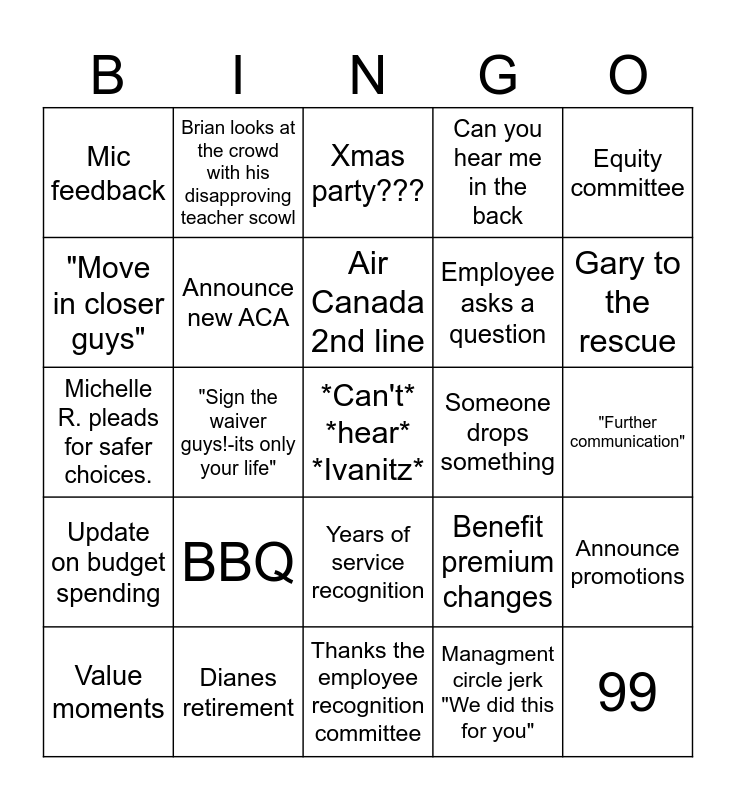 This bingo card has a free space and 24 words: BBQ, Dianes retirement, Air Canada 2nd line, Value moments, Equity committee, Mic feedback, "Move in closer guys", Brian looks at the crowd with his disapproving teacher scowl, Someone drops something, Years of service recognition, Employee asks a question, Michelle R. pleads for safer choices., Benefit premium changes, Announce promotions, Announce new ACA, Managment circle jerk "We did this for you", "Further communication", Xmas party???, Gary to the rescue, "Sign the waiver guys!-its only your life", 99, Update on budget spending, Can you hear me in the back and Thanks the employee recognition committee.