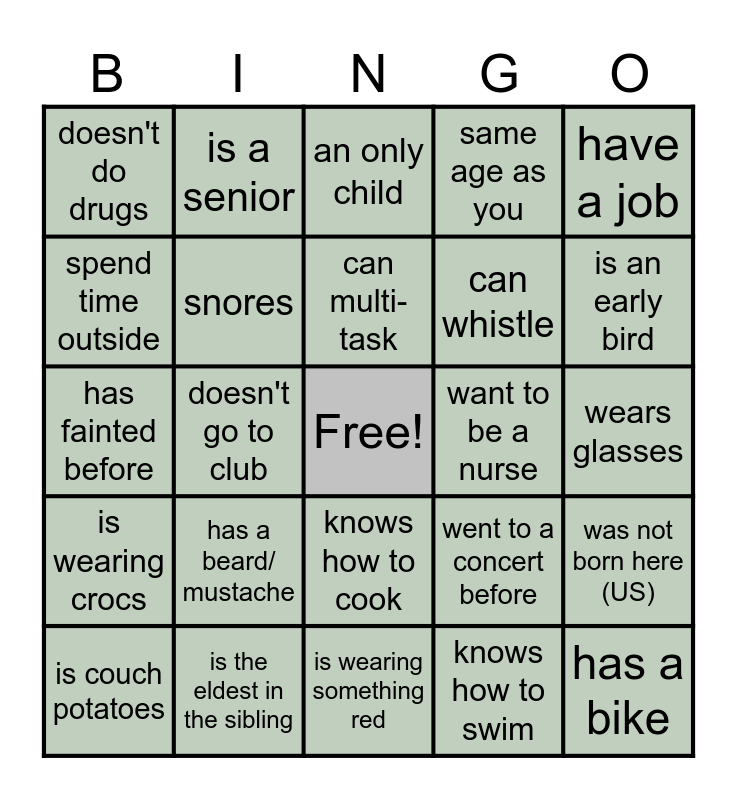 This bingo card has a free space and 24 words: has a beard/ mustache, is the eldest in the sibling, can multi- task, is couch potatoes, have a job, doesn't do drugs, spend time outside, is a senior, want to be a nurse, knows how to cook, can whistle, has fainted before, went to a concert before, was not born here (US), snores, knows how to swim, wears glasses, an only child, is an early bird, doesn't go to club, has a bike, is wearing crocs, same age as you and is wearing something red.