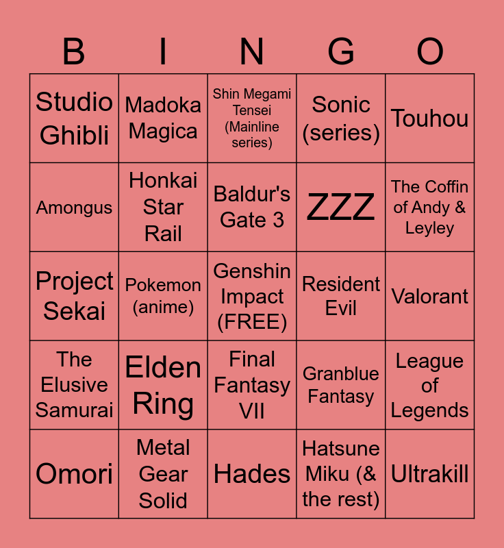 This bingo card has a free space and 59 words: Slay The Spire, Metal Gear Solid, Frieren, The Elusive Samurai, Hatsune Miku (& the rest), Persona 3, Honkai Star Rail, Pokemon Sun & Moon, ZZZ, Persona 5, Sonic (series), Needy Streamer Overload, Amongus, Deadpool, Dangan-ronpa, Studio Ghibli, Ultrakill, Touhou, The Witcher 3, Baldur's Gate 3, Resident Evil, Shin Megami Tensei (Mainline series), Omori, League of Legends, Lethal Company, Roblox, Persona 4, Devil May Cry, The Coffin of Andy & Leyley, Star Wars, Star Trek, Lord of the Rings, Doctor Who, Sherlock, Madoka Magica, K-ON!, Pokemon Scarlet & Violet, Pokemon (anime), Dungeon Meshi, Project Sekai, Ensemble Stars, Elden Ring, Valorant, Borderlands, Yugioh!, DOOM, Guilty Gear, Final Fantasy XVI, Final Fantasy VII, Hades, Dr. Strange, Stardew Valley, Fate, Fallout, Hi-Fi Rush, Granblue Fantasy, Assassin's Creed, Cyberpunk 2077 and Iron Man.