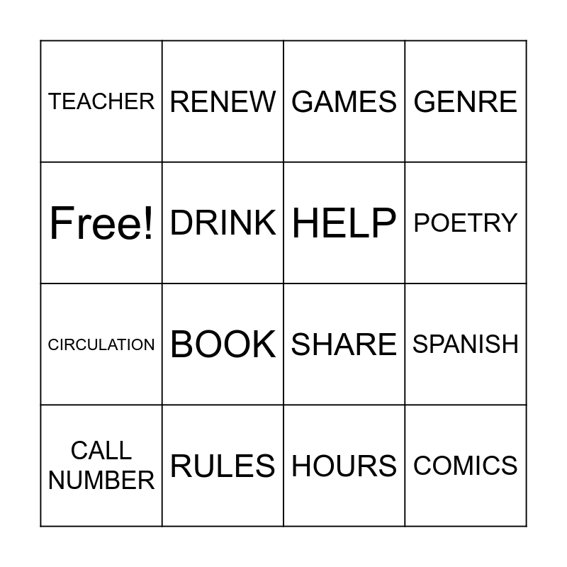 This bingo card has 39 words: FICTION, NONFICTION, BIOGRAPHY, HELP, QUICK PICKS, STORY COLLECTION, POETRY, GRAPHIC NOVELS, Free!, COMICS, SPANISH, GENRE, CALL NUMBER, HOURS, RULES, QUIET, SCAN IN, TEACHER, STUDY HALL, FOOD, DRINK, ID, CIRCULATION, BOOK, CATALOG, KIOSK, DESTINY DISCOVER, FLIPSTER, CHECKOUT, RENEW, FINES, WILDCAT DEN, GAMES, PUZZLES, PRINTING, SUPPLIES, WEGOLRC.ORG, SHARE and TUTORING.