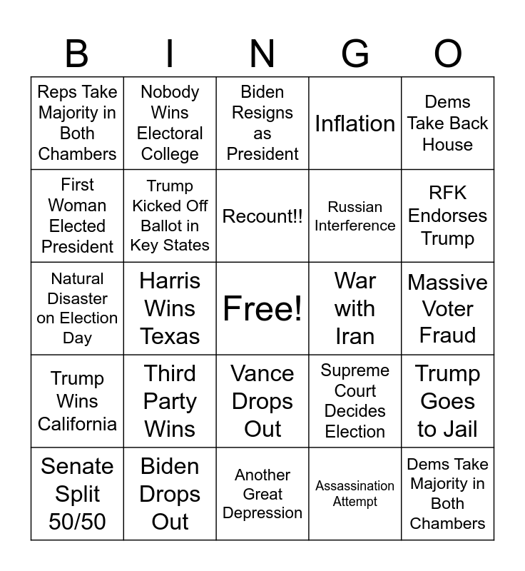 This bingo card has a free space and 24 words: Third Party Wins, Biden Drops Out, Recount!!, Senate Split 50/50, Dems Take Back House, Reps Take Majority in Both Chambers, First Woman Elected President, Nobody Wins Electoral College, War with Iran, Vance Drops Out, Russian Interference, Natural Disaster on Election Day, Supreme Court Decides Election, Trump Goes to Jail, Trump Kicked Off Ballot in Key States, Assassination Attempt, Massive Voter Fraud, Biden Resigns as President, RFK Endorses Trump, Harris Wins Texas, Dems Take Majority in Both Chambers, Trump Wins California, Inflation and Another Great Depression.