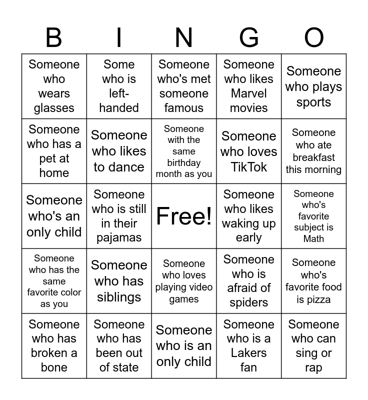 This bingo card has a free space and 24 words: Someone who has siblings, Someone who has been out of state, Someone with the same birthday month as you, Someone who has broken a bone, Someone who plays sports, Someone who wears glasses, Someone who has a pet at home, Some who is left-handed, Someone who likes waking up early, Someone who loves playing video games, Someone who loves TikTok, Someone who's an only child, Someone who is afraid of spiders, Someone who's favorite food is pizza, Someone who likes to dance, Someone who is a Lakers fan, Someone who's favorite subject is Math, Someone who's met someone famous, Someone who ate breakfast this morning, Someone who is still in their pajamas, Someone who can sing or rap, Someone who has the same favorite color as you, Someone who likes Marvel movies and Someone who is an only child.