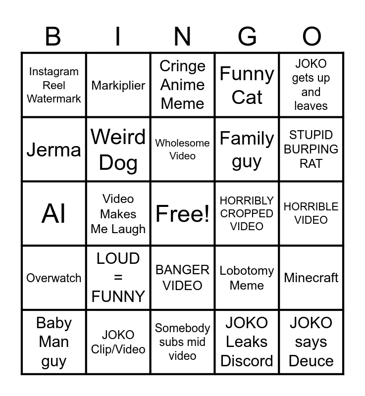 This bingo card has a free space and 24 words: LOUD = FUNNY, JOKO Clip/Video, Wholesome Video, Baby Man guy, JOKO gets up and leaves, Instagram Reel Watermark, Jerma, Markiplier, HORRIBLY CROPPED VIDEO, BANGER VIDEO, Family guy, AI, Lobotomy Meme, Minecraft, Weird Dog, JOKO Leaks Discord, HORRIBLE VIDEO, Cringe Anime Meme, STUPID BURPING RAT, Video Makes Me Laugh, JOKO says Deuce, Overwatch, Funny Cat and Somebody subs mid video.