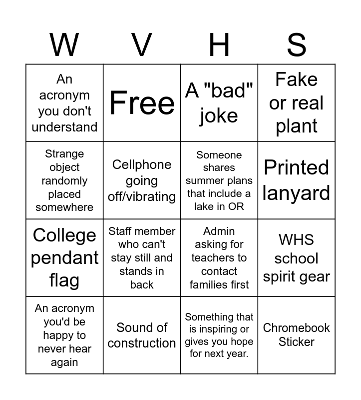 This bingo card has 19 words: Admin asking for teachers to contact families first, "knock on wood" or "fingers-crossed", A "bad" joke, Chromebook Sticker, WHS school spirit gear, Strange object randomly placed somewhere, Something that is inspiring or gives you hope for next year., An acronym you don't understand, Free, College pendant flag, Staff member who can't stay still and stands in back, Cellphone going off/vibrating, Someone shares summer plans that include a lake in OR, Sound of construction, An acronym you'd be happy to never hear again, Stomach growl/someone saying they're hungry, Fake or real plant, Printed lanyard and Question about cellphones in bathroom.
