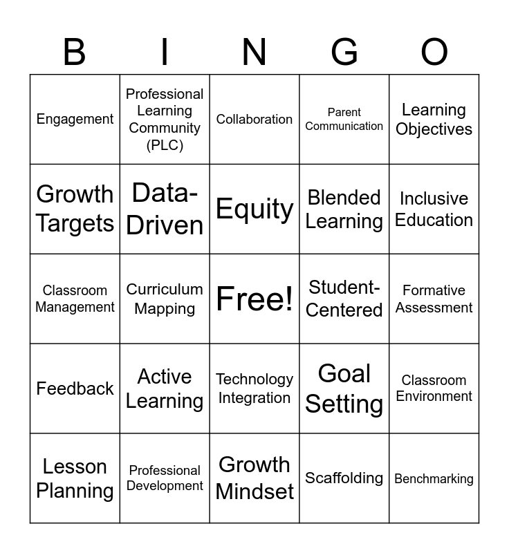 This bingo card has a free space and 30 words: Professional Development, Differentiation, Curriculum Mapping, Assessment, Engagement, Collaboration, Data-Driven, Technology Integration, Student-Centered, Growth Mindset, Formative Assessment, Benchmarking, Scaffolding, SEL (Social-Emotional Learning), Inclusive Education, Instructional Strategies, Goal Setting, Feedback, Active Learning, Learning Objectives, Classroom Management, Reflection, Professional Learning Community (PLC), Blended Learning, Growth Targets, Parent Communication, Classroom Environment, Lesson Planning, Equity and Student Outcomes.