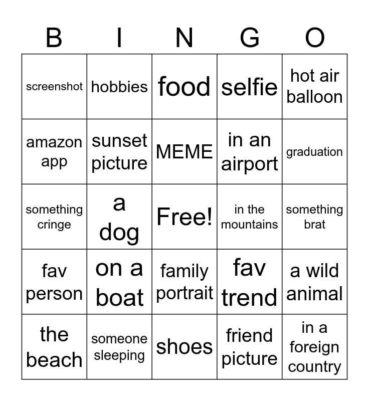 This bingo card has a free space and 24 words: the beach, on a boat, MEME, friend picture, hot air balloon, screenshot, hobbies, food, in the mountains, something brat, something cringe, sunset picture, fav trend, a wild animal, amazon app, someone sleeping, shoes, selfie, graduation, fav person, a dog, family portrait, in an airport and in a foreign country.