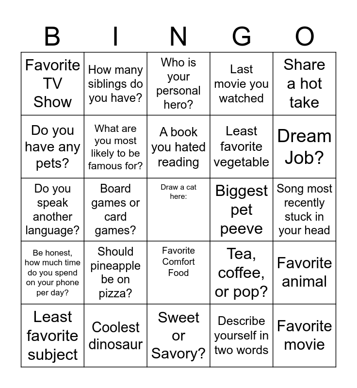 This bingo card has a free space and 30 words: Coolest dinosaur, Are you in any activities or sports?, Board games or card games?, Favorite chain restaurant, Favorite TV Show, Who is your personal hero?, What are you most likely to be famous for?, Favorite Comfort Food, Biggest pet peeve, Sweet or Savory?, Song most recently stuck in your head, Favorite movie, Describe yourself in two words, Favorite Halloween Costume, Dream Job?, Create a handshake with your partner., Tea, coffee, or pop?, Be honest, how much time do you spend on your phone per day?, Should pineapple be on pizza?, Share a hot take, Do you speak another language?, Rock, Paper, Scissors. Only cross this out if you win!, How many siblings do you have?, Least favorite vegetable, Do you have any pets?, Last movie you watched, Favorite animal, Least favorite subject, A book you hated reading and Socks or barefeet?.