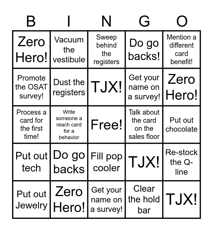 This bingo card has a free space and 24 words: Do go backs, Zero Hero!, TJX!, Put out Jewelry, Mention a different card benefit!, Zero Hero!, Promote the OSAT survey!, Vacuum the vestibule, Talk about the card on the sales floor, Fill pop cooler, Get your name on a survey!, Process a card for the first time!, TJX!, Re-stock the Q-line, Dust the registers, Clear the hold bar, Put out chocolate, Sweep behind the registers, Zero Hero!, Write someone a reach card for a behavior, TJX!, Put out tech, Do go backs! and Get your name on a survey!.
