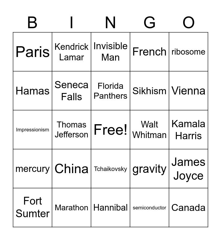 This bingo card has a free space and 24 words: China, Marathon, Florida Panthers, Fort Sumter, ribosome, Paris, Hamas, Kendrick Lamar, Walt Whitman, Tchaikovsky, Sikhism, Impressionism, gravity, James Joyce, Seneca Falls, semiconductor, Kamala Harris, Invisible Man, Vienna, Thomas Jefferson, Canada, mercury, French and Hannibal.