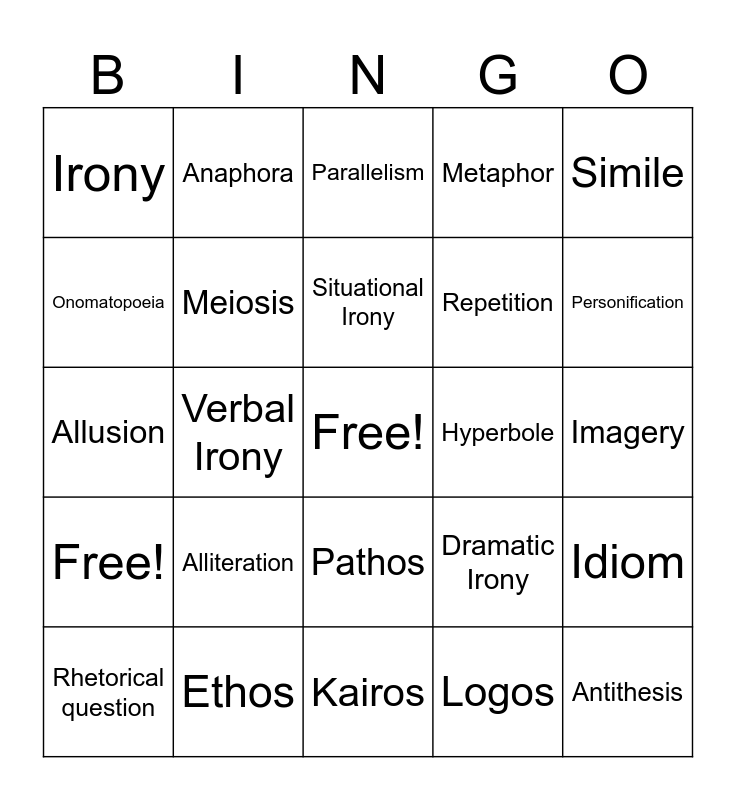 This bingo card has a free space and 24 words: Alliteration, Ethos, Situational Irony, Rhetorical question, Simile, Irony, Onomatopoeia, Anaphora, Hyperbole, Pathos, Repetition, Allusion, Dramatic Irony, Idiom, Meiosis, Logos, Imagery, Parallelism, Personification, Verbal Irony, Antithesis, Free!, Metaphor and Kairos.