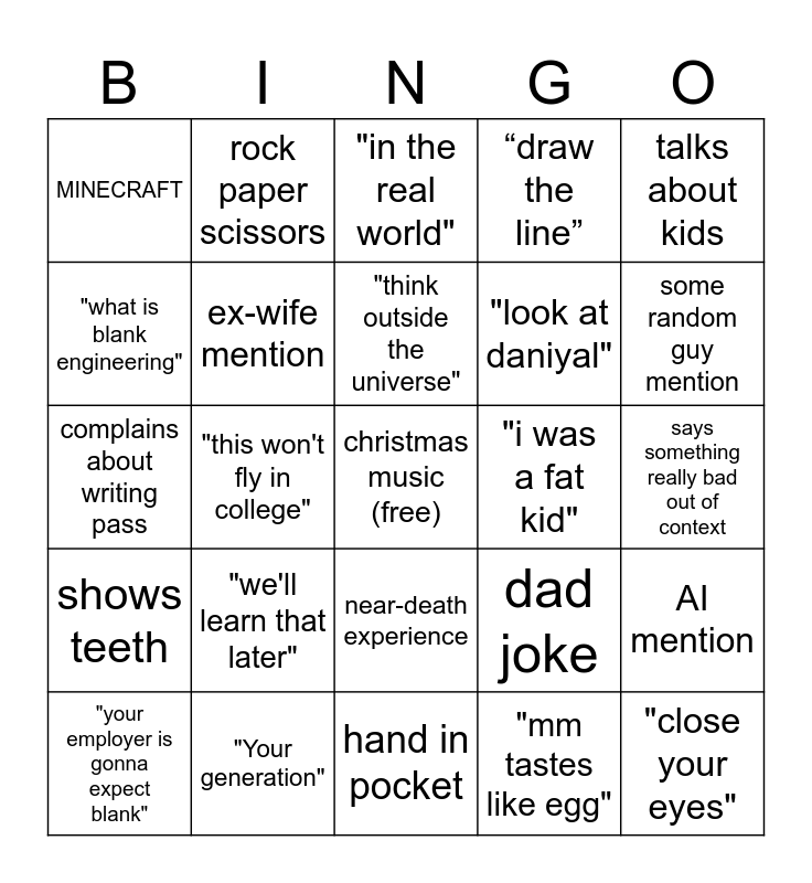 This bingo card has a free space and 60 words: art degree mention, "Your generation", “i sold my engineering notebook”, shows teeth, "mm tastes like egg", "YASMINE", ex-wife mention, “i worked at a prison”, "look at daniyal", "you gotta have the knowledge", “draw the line”, "hired me cause of what i know", "what is blank engineering", "you gotta know it from the inside", electric water analogy, MINECRAFT, "close your eyes", talks about kids, talks about grandkids, "think outside the universe", "i was a fat kid", "in the real world", "your employer is gonna expect blank", AI mention, someone comes in mid-period ("get out"), hrishi mention, "i have a free apartment", lake highlands guy, some random guy mention, i was a bad kid, assumes we know everything, "yall know about blank right?", "im old", "i do pushups every morning", rock paper scissors, "idk can you", "yall are seniors right?", "this won't fly in college", random demonstration, complains about writing pass, phone rant, "we'll learn that later", says something really bad out of context, unnecessary hand movements, dad joke, “quit it”, calls out someone's clothes, crowbar incident (too much iron), machine safety, near-death experience, hand in pocket, sweet tea mention, former student mention, points to pictures on wall, “you learn this in insert class”, “my cs kids know this”, binary mention, “you gotta see the patterns”, mentions issue with district and certification mention.