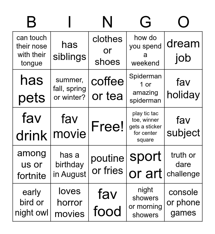 This bingo card has a free space and 24 words: has a birthday in August, loves horror movies, coffee or tea, early bird or night owl, dream job, can touch their nose with their tongue, has pets, has siblings, play tic tac toe, winner gets a sticker for center square, poutine or fries, Spiderman 1 or amazing spiderman, fav drink, sport or art, truth or dare challenge, summer, fall, spring or winter?, night showers or morning showers, fav subject, clothes or shoes, fav holiday, fav movie, console or phone games, among us or fortnite, how do you spend a weekend and fav food.