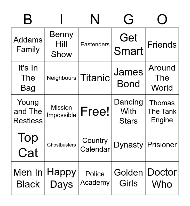 This bingo card has a free space and 24 words: Ghostbusters, Happy Days, Titanic, Men In Black, Friends, Addams Family, It's In The Bag, Benny Hill Show, Dancing With Stars, Country Calendar, James Bond, Young and The Restless, Dynasty, Prisioner, Neighbours, Golden Girls, Thomas The Tank Engine, Eastenders, Around The World, Mission Impossible, Doctor Who, Top Cat, Get Smart and Police Academy.