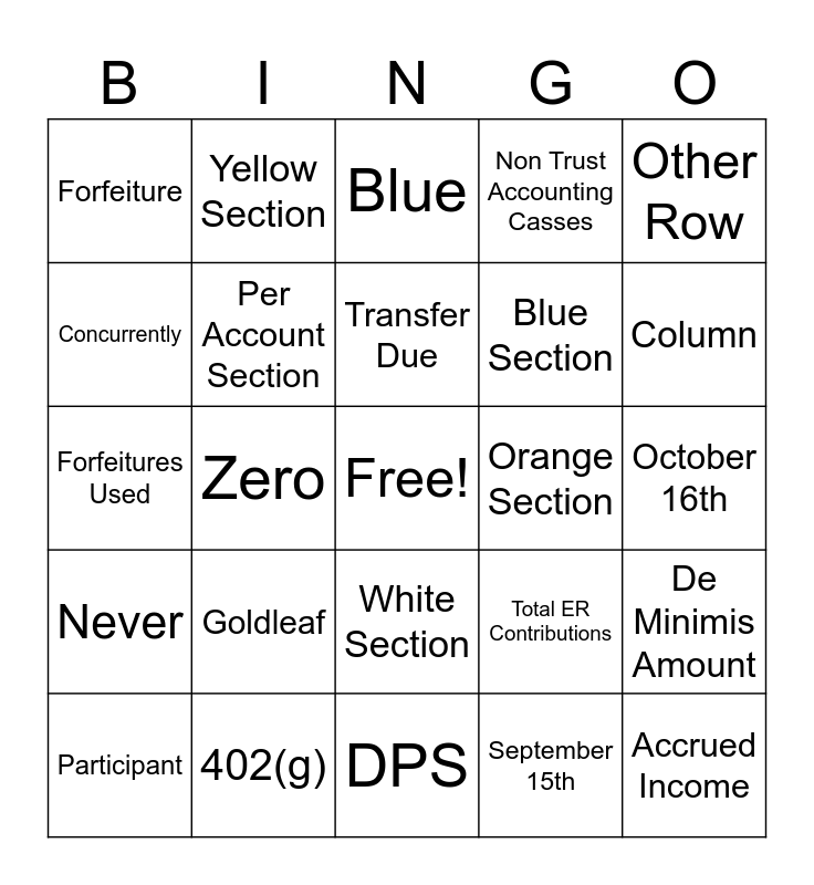 This bingo card has a free space and 24 words: Goldleaf, 402(g), Transfer Due, Participant, Other Row, Forfeiture, Concurrently, Yellow Section, Orange Section, White Section, Blue Section, Forfeitures Used, Total ER Contributions, De Minimis Amount, Per Account Section, September 15th, October 16th, Blue, Column, Zero, Accrued Income, Never, Non Trust Accounting Casses and DPS.