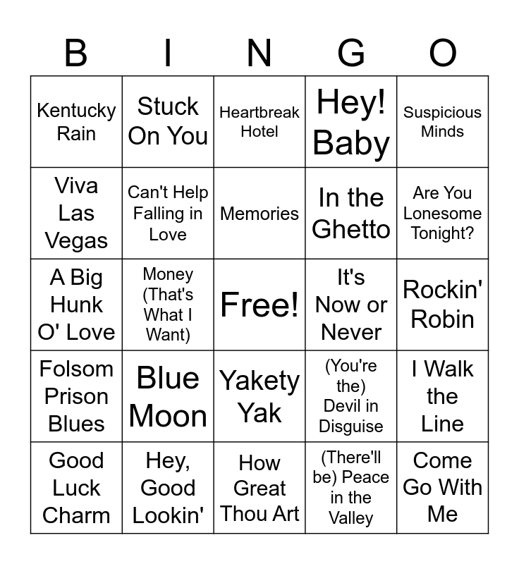 This bingo card has a free space and 75 words: That's All Right, Baby, Let's Play House, Heartbreak Hotel, Blue Suede Shoes, Hound Dog, Don't Be Cruel, Love Me Tender, All Shook Up, (There'll be) Peace in the Valley, Jailhouse Rock, Trouble, Fever, It's Now or Never, Are You Lonesome Tonight?, Little Sister, Can't Help Falling in Love, Return to Sender, (You're the) Devil in Disguise, Bossa Nova Baby, Viva Las Vegas, A Little More Conversation, Memories, In the Ghetto, Suspicious Minds, Kentucky Rain, Polk Salad Annie, Burnin' Love, Always on My Mind, Too Much, (Let Me Be Your) Teddy Bear, Walkin' After Midnight, Hard Headed Woman, Mr Sandman, I Walk the Line, A Big Hunk O' Love, Stuck On You, Day-O (The Banana Boat Song), A Teenager In Love, Rockin' Robin, Good Luck Charm, Cryin' In the Chapel, At the Hop, Why Do Fools Fall In Love, Joshua Fit the Battle, Swing Down Sweet Chariot, Mansion Over the Hilltop, Yakety Yak, Hey! Baby, In the Garden, Farther Along, Stand By Me, How Great Thou Art, Without Him, Where Could I Go But to the Lord, Where No One Stands Alone, He Touched Me, Amazing Grace, When the Saints Go Marching In, Just a Little Talk With Jesus, Whole Lotta Shakin Going On, Hey, Good Lookin', Lollipop, Earth Angel, Tequila, La Bamba, Money (That's What I Want), That's Amore, Papa Loves Mambo, Splish, Folsom Prison Blues, Blue Moon, That'll Be the Day, Chantilly Lace, Come Go With Me and El Paso.