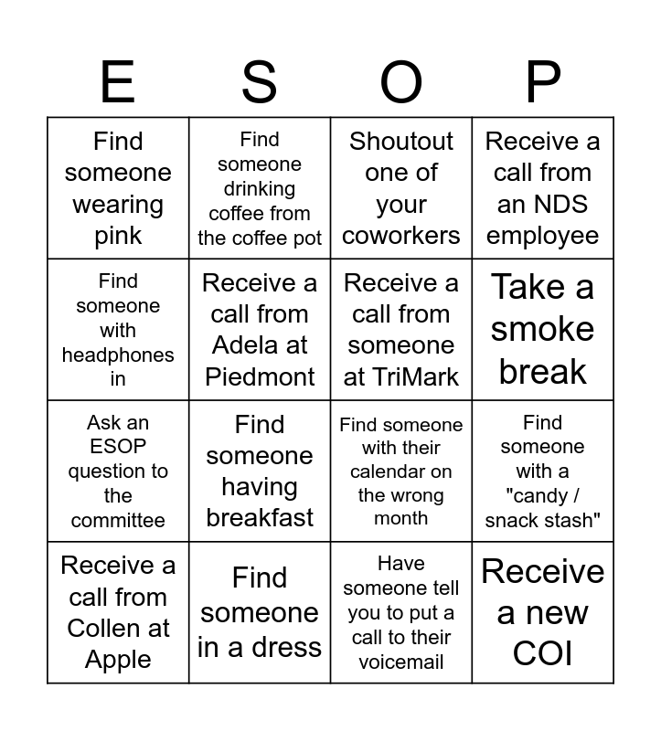 This bingo card has 16 words: Find someone in a dress, Find someone with a "candy / snack stash", Shoutout one of your coworkers, Find someone wearing pink, Ask an ESOP question to the committee, Find someone drinking coffee from the coffee pot, Find someone with their calendar on the wrong month, Have someone tell you to put a call to their voicemail, Find someone with headphones in, Receive a call from Adela at Piedmont, Receive a call from Collen at Apple, Receive a call from an NDS employee, Find someone having breakfast, Take a smoke break, Receive a call from someone at TriMark and Receive a new COI.