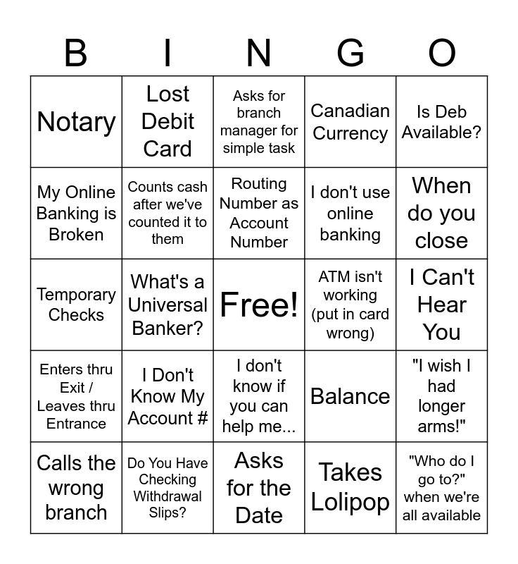 This bingo card has a free space and 24 words: I Don't Know My Account #, Do You Have Checking Withdrawal Slips?, Routing Number as Account Number, Calls the wrong branch, Is Deb Available?, Notary, My Online Banking is Broken, Lost Debit Card, ATM isn't working (put in card wrong), I don't know if you can help me..., I don't use online banking, Temporary Checks, Balance, "I wish I had longer arms!", Counts cash after we've counted it to them, Takes Lolipop, I Can't Hear You, Asks for branch manager for simple task, When do you close, What's a Universal Banker?, "Who do I go to?" when we're all available, Enters thru Exit / Leaves thru Entrance, Canadian Currency and Asks for the Date.