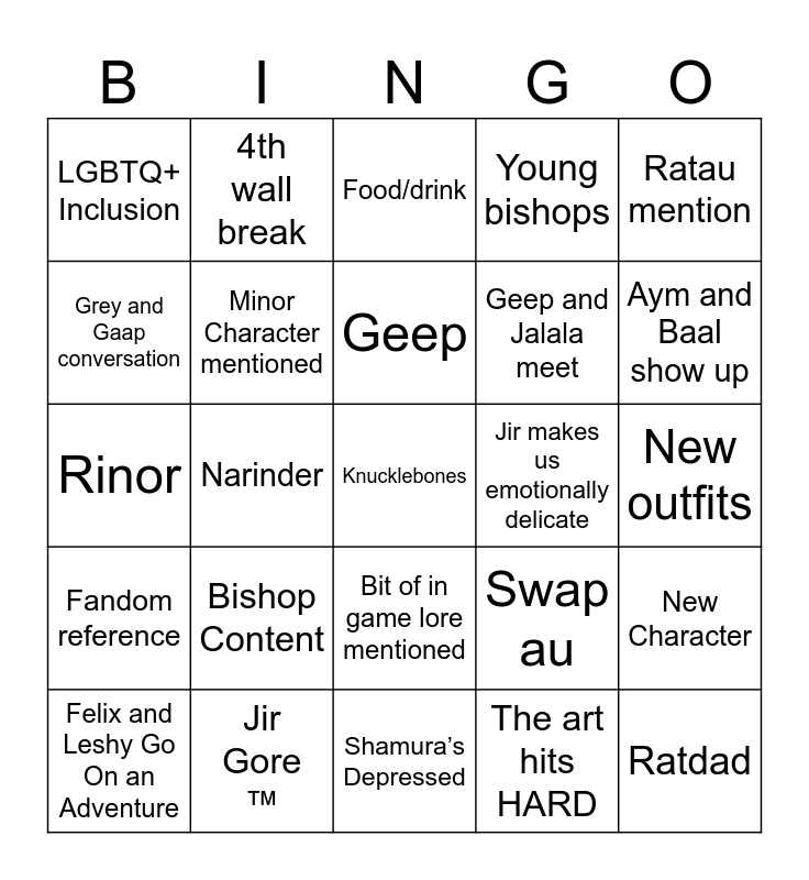 This bingo card has a free space and 24 words: Bishop Content, Jir Gore ™️, Geep, Felix and Leshy Go On an Adventure, Ratau mention, LGBTQ+ Inclusion, Grey and Gaap conversation, 4th wall break, Jir makes us emotionally delicate, Bit of in game lore mentioned, Geep and Jalala meet, Rinor, Swap au, New Character, Minor Character mentioned, The art hits HARD, New outfits, Food/drink, Aym and Baal show up, Narinder, Ratdad, Fandom reference, Young bishops and Shamura’s Depressed.
