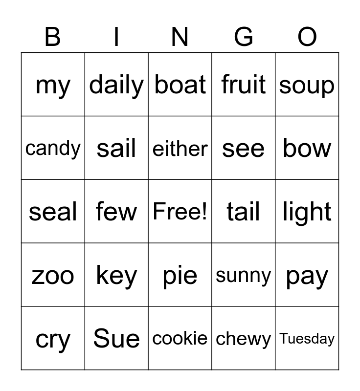 This bingo card has a free space and 25 words: key, cookie, either, cry, soup, my, candy, daily, tail, pie, see, seal, sunny, pay, sail, lie, light, boat, bow, few, Tuesday, Sue, zoo, fruit and chewy.