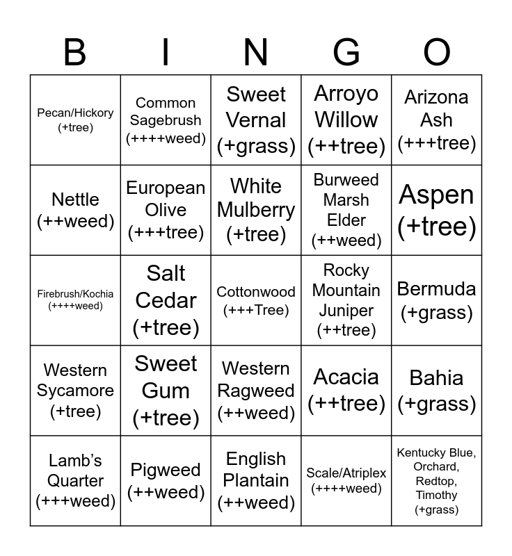 This bingo card has a free space and 36 words: Maple-box/Elder (+tree), Siberian Elm (++tree), Utah Juniper (++tree), European Olive (+++tree), Acacia (++tree), Western Sycamore (+tree), White Mulberry (+tree), Mesquite (++tree), Arizona Ash (+++tree), Hackberry (++tree), Salt Cedar (+tree), Arroyo Willow (++tree), Mountain Cedar (++tree), Rocky Mountain Juniper (++tree), Aspen (+tree), Pecan/Hickory (+tree), Black Walnut (+tree), Sweet Gum (+tree), Kentucky Blue, Orchard, Redtop, Timothy (+grass), Sweet Vernal (+grass), Bermuda (+grass), Bahia (+grass), Pigweed (++weed), Lamb’s Quarter (+++weed), English Plantain (++weed), Common Sagebrush (++++weed), Firebrush/Kochia (++++weed), Cockleburr (++weed), Burweed Marsh Elder (++weed), Nettle (++weed), Baccharis (+++weed), Russian Thistle (tumbleweed) (++++weed), Scale/Atriplex (++++weed), Western Ragweed (++weed), Alfalfa (+weed) and Rabbit Bush (camisha) (+weed).