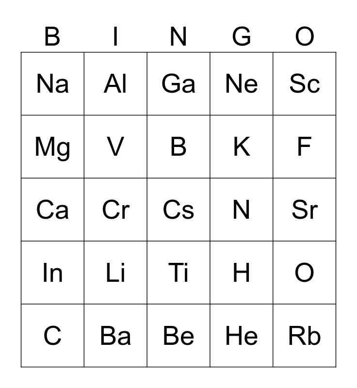 This bingo card has 25 words: Li, Be, B, C, Sc, Na, Mg, Al, N, Ti, K, Ca, H, O, V, Rb, Sr, Ga, F, Cr, Cs, Ba, In, Ne and He.