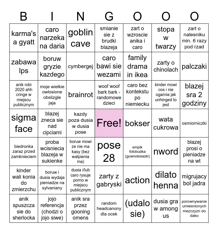 This bingo card has a free space and 48 words: action, zarty o chinolach, random headcanony dla ocek, blazej zneca sie nad cipciami, brainrot, osmiorniczki, caro narzeka na daria, jojo referencja (chodzi o jojo siwe), stopa w twarzy, pose 28, zart o nalesniku min. 6 razy pod rzad, smianie sie z brudki blazeja, kinder mowi cos i nie ogarnia jak unhinged to jest, caro bez kontekstu po niemiecku, kinder wali konia do zmierzchu, wata cukrowa, zabawa lps, palczaki, dilato henna, zart o wzroscie anika i caro, family drama in ikea, kazdy poza dusia w dusia pose, karma's a gyatt, boruw gryzie kazdego, migrujacy bol jadra, cymbergej, blazej sra 2 godziny, anik spuszcza sie do sherlocka, woof woof bark bark - randomowe dzieci, moje wielkie owlosione obslizgle jaja, dusia gra w among us, bokser, blazej prosi o pieniadze na wt, boruw i dusia wydaja pieniadze na sylvaniany, sigma face, empik fotobudka (guwnoksiazki), nword, anik robi 2020 ahh cringe w miejscu publicznym, boruw mowi ze nie ma kasy (bez watpienia ma), dusia i/lub caro rysuje porno w miejscu publicznym, biedronka zaraz przed zamknieciem, porownywanie umiesnionych mezczyzn do dako, goblin cave, anik sra przez gooning omens, caro bawi sie wezami, zarty z gabryski, proba wcisniecia blazeja w sukienke and (udalo sie).