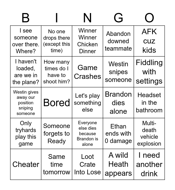 This bingo card has 25 words: Someone forgets to Ready, Loot Crate Into Lose, Game Crashes, Cheater, AFK cuz kids, I see someone over there. Where?, I haven't loaded, are we in the plane?, No one drops there (except this time), Brandon dies alone, Everyone else dies because Brandon is alone, Westin snipes someone, Westin gives away our position sniping someone, Ethan ends with 0 damage, Multi-death vehicle explosion, How many times do I have to shoot him?, I need another drink, Headset in the bathroom, Winner Winner Chicken Dinner, Fiddling with settings, Bored, Let's play something else, Same time tomorrow, Only tryhards play this game, Abandon downed teammate and A wild Heath appears.