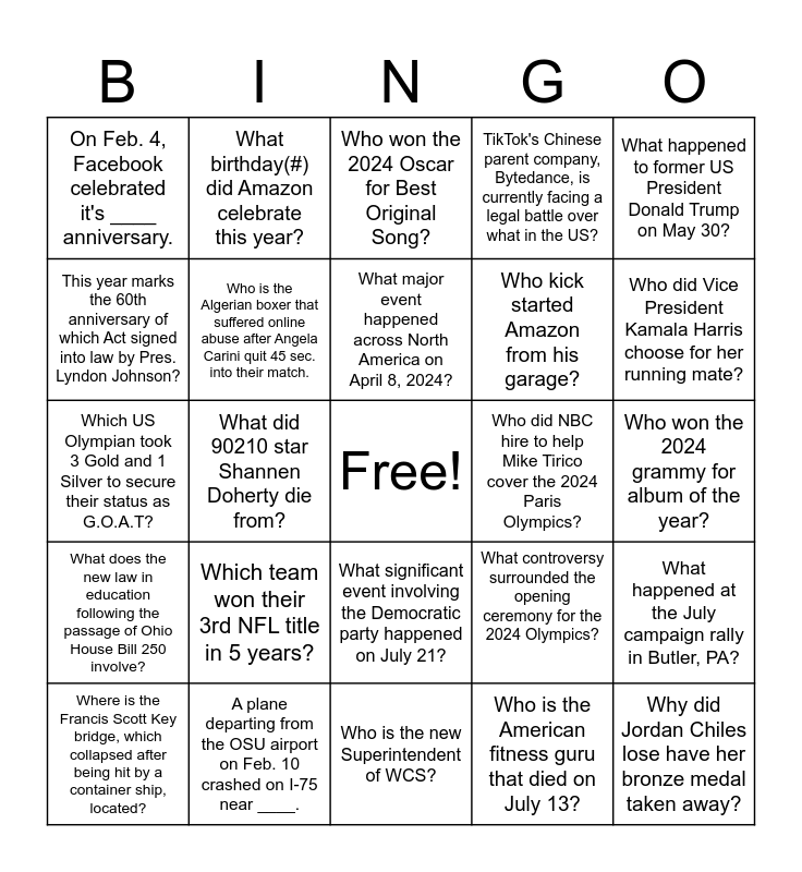 This bingo card has a free space and 24 words: Which team won their 3rd NFL title in 5 years?, A plane departing from the OSU airport on Feb. 10 crashed on I-75 near ____., What major event happened across North America on April 8, 2024?, Where is the Francis Scott Key bridge, which collapsed after being hit by a container ship, located?, What happened to former US President Donald Trump on May 30?, On Feb. 4, Facebook celebrated it's ____ anniversary., This year marks the 60th anniversary of which Act signed into law by Pres. Lyndon Johnson?, What birthday(#) did Amazon celebrate this year?, Who did NBC hire to help Mike Tirico cover the 2024 Paris Olympics?, What significant event involving the Democratic party happened on July 21?, Who kick started Amazon from his garage?, Which US Olympian took 3 Gold and 1 Silver to secure their status as G.O.A.T?, What controversy surrounded the opening ceremony for the 2024 Olympics?, What happened at the July campaign rally in Butler, PA?, Who is the Algerian boxer that suffered online abuse after Angela Carini quit 45 sec. into their match., Who is the American fitness guru that died on July 13?, Who won the 2024 grammy for album of the year?, Who won the 2024 Oscar for Best Original Song?, Who did Vice President Kamala Harris choose for her running mate?, What did 90210 star Shannen Doherty die from?, Why did Jordan Chiles lose have her bronze medal taken away?, What does the new law in education following the passage of Ohio House Bill 250 involve?, TikTok's Chinese parent company, Bytedance, is currently facing a legal battle over what in the US? and Who is the new Superintendent of WCS?.