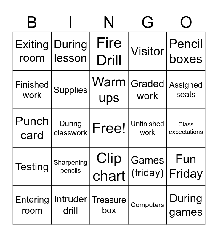 This bingo card has a free space and 24 words: Sharpening pencils, Intruder drill, Warm ups, Entering room, Pencil boxes, Exiting room, Finished work, During lesson, Unfinished work, Clip chart, Graded work, Punch card, Games (friday), Fun Friday, Supplies, Computers, Class expectations, Fire Drill, Assigned seats, During classwork, During games, Testing, Visitor and Treasure box.