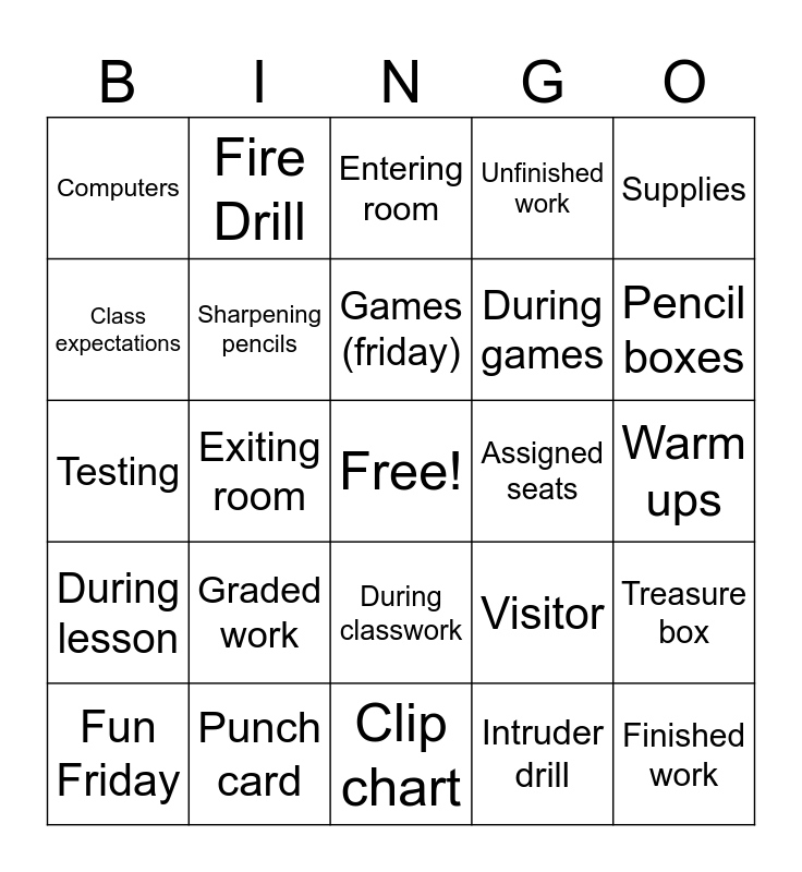 This bingo card has a free space and 24 words: Graded work, Punch card, Games (friday), Fun Friday, Supplies, Computers, Class expectations, Fire Drill, Assigned seats, During classwork, During games, Testing, Visitor, Treasure box, Sharpening pencils, Intruder drill, Warm ups, Entering room, Pencil boxes, Exiting room, Finished work, During lesson, Unfinished work and Clip chart.