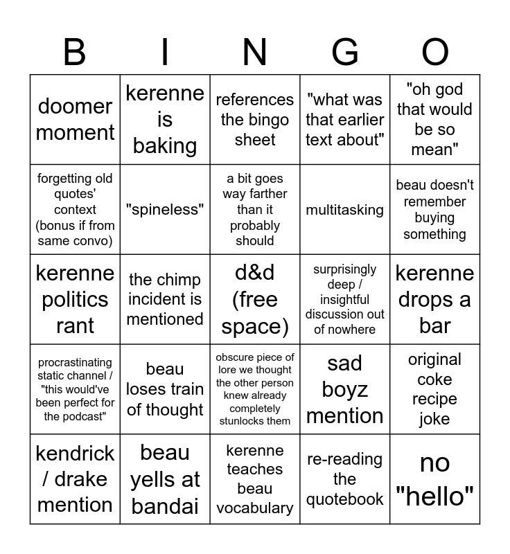 This bingo card has a free space and 28 words: original coke recipe joke, capitalism bad, multitasking, re-reading the quotebook, forgetting old quotes' context (bonus if from same convo), references the bingo sheet, kerenne is baking, procrastinating static channel / "this would've been perfect for the podcast", surprisingly deep / insightful discussion out of nowhere, kendrick / drake mention, kerenne politics rant, "what was that earlier text about", beau yells at bandai, kerenne teaches beau vocabulary, beau doesn't remember buying something, beau's job sucks, beau loses train of thought, "spineless", a bit goes way farther than it probably should, obscure piece of lore we thought the other person knew already completely stunlocks them, doomer moment, kerenne "there's something in the water" joke, no "hello", the chimp incident is mentioned, kerenne drops a bar, sad boyz mention, "oh god that would be so mean" and kerenne still hasn't played hades ii yet.