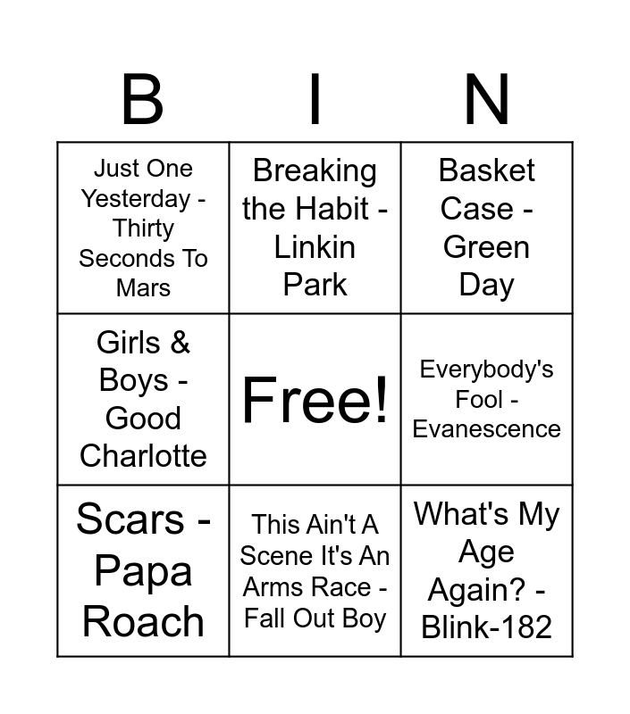 This bingo card has a free space and 29 words: I'm Just a Kid - Simple Plan, Sk8er Boi - Avril Lavigne, Your Betrayal - Bullet For My Valentine, Helena - My Chemical Romance, Just One Yesterday - Thirty Seconds To Mars, Basket Case - Green Day, Scars - Papa Roach, crushcrushcrush - Paramore, Red Flag - Billy Talent, Kings And Queens - Good Charlotte, Kryptonite - 3 Doors Down, Sugar We're Going Down - Fall Out Boy, Riot - Three Days Grace, Holiday - Green Day, Situations - Escape the Fate, Somewhere I Belong - Linkin Park, Until the Day I Die - Story of the Year, Teenagers - My Chemical Romance, What's My Age Again? - Blink-182, From Yesterday - Thirty Seconds To Mars, I Just Wanna Live - Good Charlotte, Lying Is the Most Fun a Girl Can Have Without Taking Her Clothes Off - Panic! At The Disco, All I Wanted - Paramore, Everybody's Fool - Evanescence, Girls & Boys - Good Charlotte, Breaking the Habit - Linkin Park, The Middle - Jimmy Eat World, This Ain't A Scene It's An Arms Race - Fall Out Boy and Call Me When You're Sober - Evanescence.