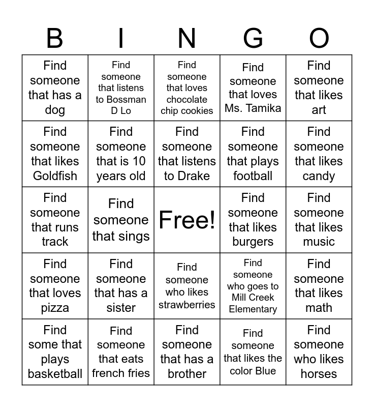 This bingo card has a free space and 24 words: Find some that plays basketball, Find someone that has a sister, Find someone that listens to Drake, Find someone that likes the color Blue, Find someone that likes art, Find someone that has a dog, Find someone that listens to Bossman D Lo, Find someone that loves chocolate chip cookies, Find someone that likes burgers, Find someone that likes music, Find someone that runs track, Find someone that is 10 years old, Find someone who goes to Mill Creek Elementary, Find someone that likes math, Find someone that likes Goldfish, Find someone that eats french fries, Find someone that has a brother, Find someone that loves Ms. Tamika, Find someone that likes candy, Find someone that loves pizza, Find someone that sings, Find someone who likes strawberries, Find someone that plays football and Find someone who likes horses.