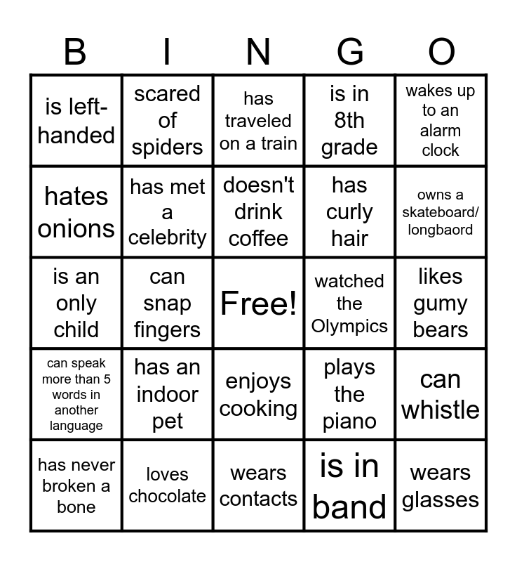 This bingo card has a free space and 24 words: has an indoor pet, loves chocolate, doesn't drink coffee, has never broken a bone, wakes up to an alarm clock, is left-handed, hates onions, scared of spiders, watched the Olympics, enjoys cooking, has curly hair, is an only child, plays the piano, can whistle, has met a celebrity, is in band, likes gumy bears, has traveled on a train, owns a skateboard/ longbaord, can snap fingers, wears glasses, can speak more than 5 words in another language, is in 8th grade and wears contacts.