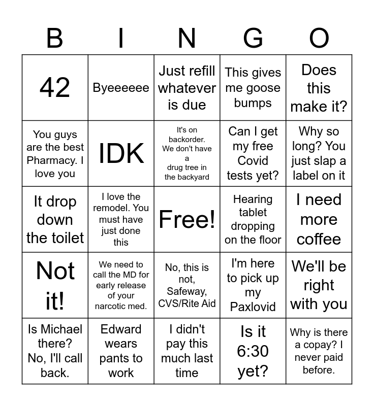 This bingo card has a free space and 34 words: First fib of the day, Is it 6:30 yet?, Michael is on a conference call, I don't work for the post office, Not it!, IDK, Does this make it?, Is Michael there? No, I'll call back., Byeeeeee, When was the last time you checked your mailbox?, It's on backorder. We don't have a drug tree in the backyard, Just refill whatever is due, I am going on vacation, but I only need my narcotic early filled., It's a little white round tablet, Hearing tablet dropping on the floor, Why so long? You just slap a label on it, Edward wears pants to work, It drop down the toilet, We need to call the MD for early release of your narcotic med., I'm here to pick up my Paxlovid, No, this is not, Safeway, CVS/Rite Aid, My Doctor said it would be ready when I got here, 42, I need more coffee, I didn't pay this much last time, Why is there a copay? I never paid before., This gives me goose bumps, Here is another Rx we need to clarify with Dr Flowers, Can I get my free Covid tests yet?, You guys are the best Pharmacy. I love you, I never knew you guys were here, I love the remodel. You must have just done this, We'll be right with you and I need something stronger than coffee.