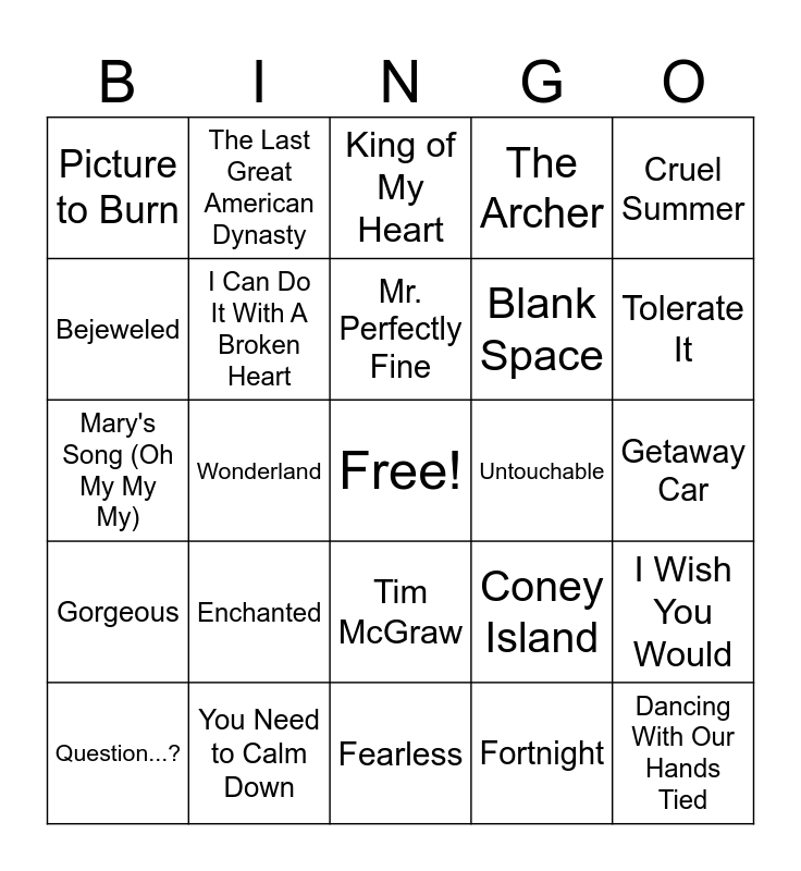 This bingo card has a free space and 64 words: Teardrops on My Guitar, Love Story, Sparks Fly, I Wish You Would, Mean, Delicate, The Last Great American Dynasty, Karma, Mr. Perfectly Fine, State of Grace, Tim McGraw, Willow, Getaway Car, Cruel Summer, I Knew You Were Trouble, Bejeweled, Wonderland, Picture to Burn, Mirrorball, Blank Space, Enchanted, Gorgeous, The Archer, Gold Rush, Forever & Always, White Horse, You Belong With Me, Long Live, We Are Never Ever Getting Back Together, Shake It Off, Paper Rings, The Lakes, No Body No Crime, Anti Hero, Tolerate It, Question...?, Right Where You Left Me, Fortnight, Who's Afraid of Little Old Me, I Can Do It With A Broken Heart, Mary's Song (Oh My My My), Untouchable, Haunted, Treacherous, Out of the Woods, Dancing With Our Hands Tied, You Need to Calm Down, Cardigan, Coney Island, Labyrinth, Florida!!!, Our Song, Fearless, Better Than Revenge, 22, Style, King of My Heart, The Man, My Tears Ricochet, Invisible String, Speak Now, Mastermind, Wildest Dreams and I Can Fix Him (No Really I Can).