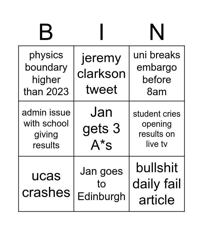 This bingo card has a free space and 9 words: ucas crashes, uni breaks embargo before 8am, jeremy clarkson tweet, admin issue with school giving results, physics boundary higher than 2023, student cries opening results on live tv, bullshit daily fail article, redditor complains about missing offer by 1 mark and Jan goes to Edinburgh.