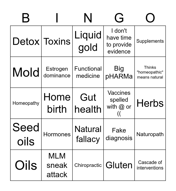 This bingo card has 25 words: Hormones, Chiropractic, Functional medicine, Oils, Supplements, Detox, Mold, Toxins, Vaccines spelled with @ or ((, Natural fallacy, Big pHARMa, Homeopathy, Fake diagnosis, Naturopath, Estrogen dominance, Cascade of interventions, Herbs, Liquid gold, Thinks "homeopathic" means natural, Home birth, Gut health, MLM sneak attack, Seed oils, I don't have time to provide evidence and Gluten.